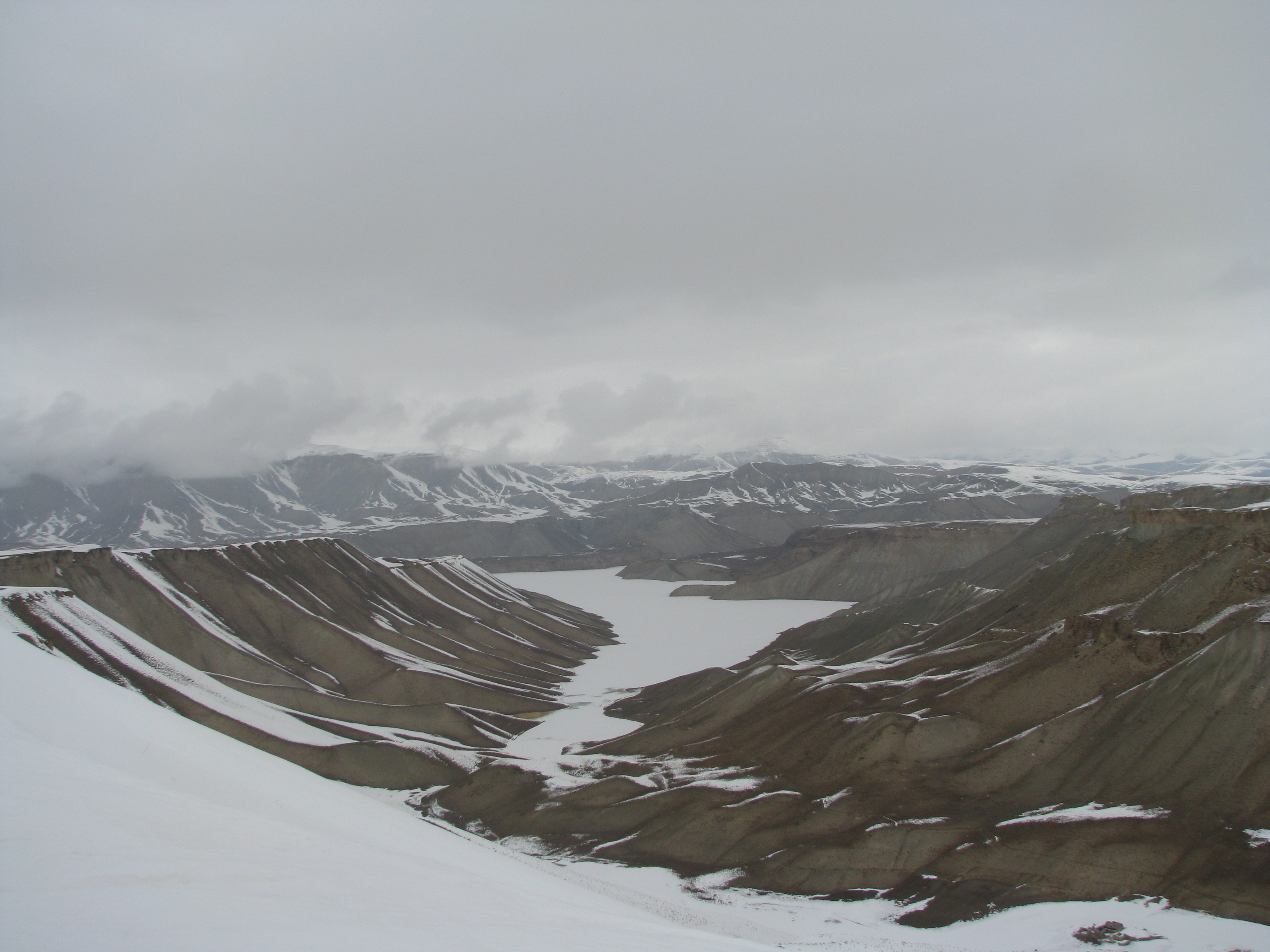 Soon after passing another adventure-van full of what looked to be wealthier city-folks who had evidently decided to give up on their journey and were cooking and eating lunch in the middle of the 1.5 lane snow-and-mud covered track, we stopped to get our first glimpse of a lake. Expecting the turquoise blue of a clear, deep, lake, we were all surprised when we saw a frozen whiteish expanse hemmed in by high, steep, brown cliffs. It was still frozen! This was Lake Zulfiqar, the northernmost of the seven (six officially) lakes that comprise Band-e-Amir. Zulfiqar means “sword” in Dari, so as you might have guessed, it is a long and narrow lake. A little while later, we reached the village of Band-e-Amir and set out to explore.