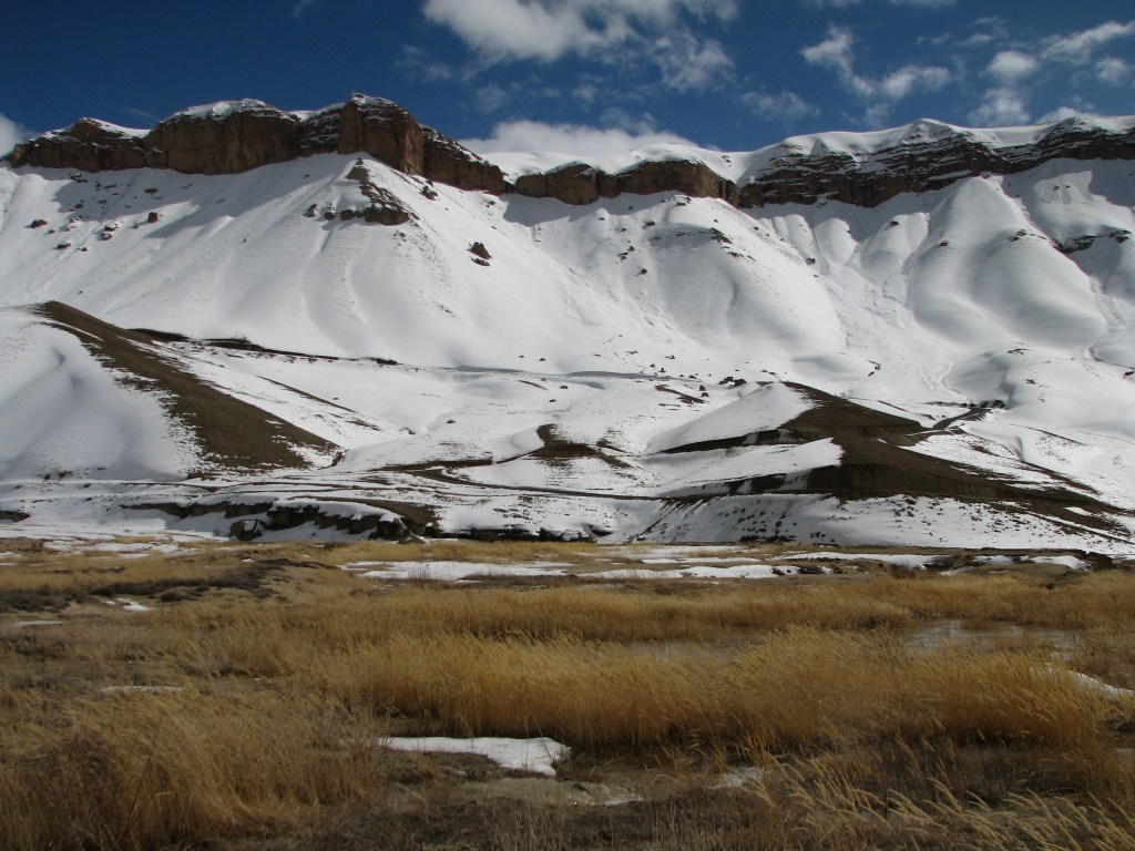 After the turnoff to Band-e-Amir, we drive about 20 meters before the driver stops, gets out, and locks the front hubs to put the van in 4WD. We proceed up the muddy ruts in the road faster than I’d like so we can make it up the hills and not get stuck. There are a few harrowing moments of fishtailing, and another one where we slid almost entirely perpendicular to the road on a downslope which lasted long enough that I had time to calculate the angle of the slope we were on, the speed we were going, and our potential resting place if we continued to skid and ended up rolling down the hill. I was busy fighting the instinct to rip off my seatbelt so I would be free (to do what, I don’t know, but it was a powerful feeling) when the driver regained control of our vehicle and we continued down the hill pointed in a more typical orientation. Conversation was a bit sparse after that, but we managed to get to our destination with no more adrenaline-producing incidents, and the snow-covered hills outside my window made it all entirely worth while. The northward facing slopes and the high parts of the Central Highlands are still pretty well blanketed in snow, though the days are warm enough now that the snow is coarse and slushy.